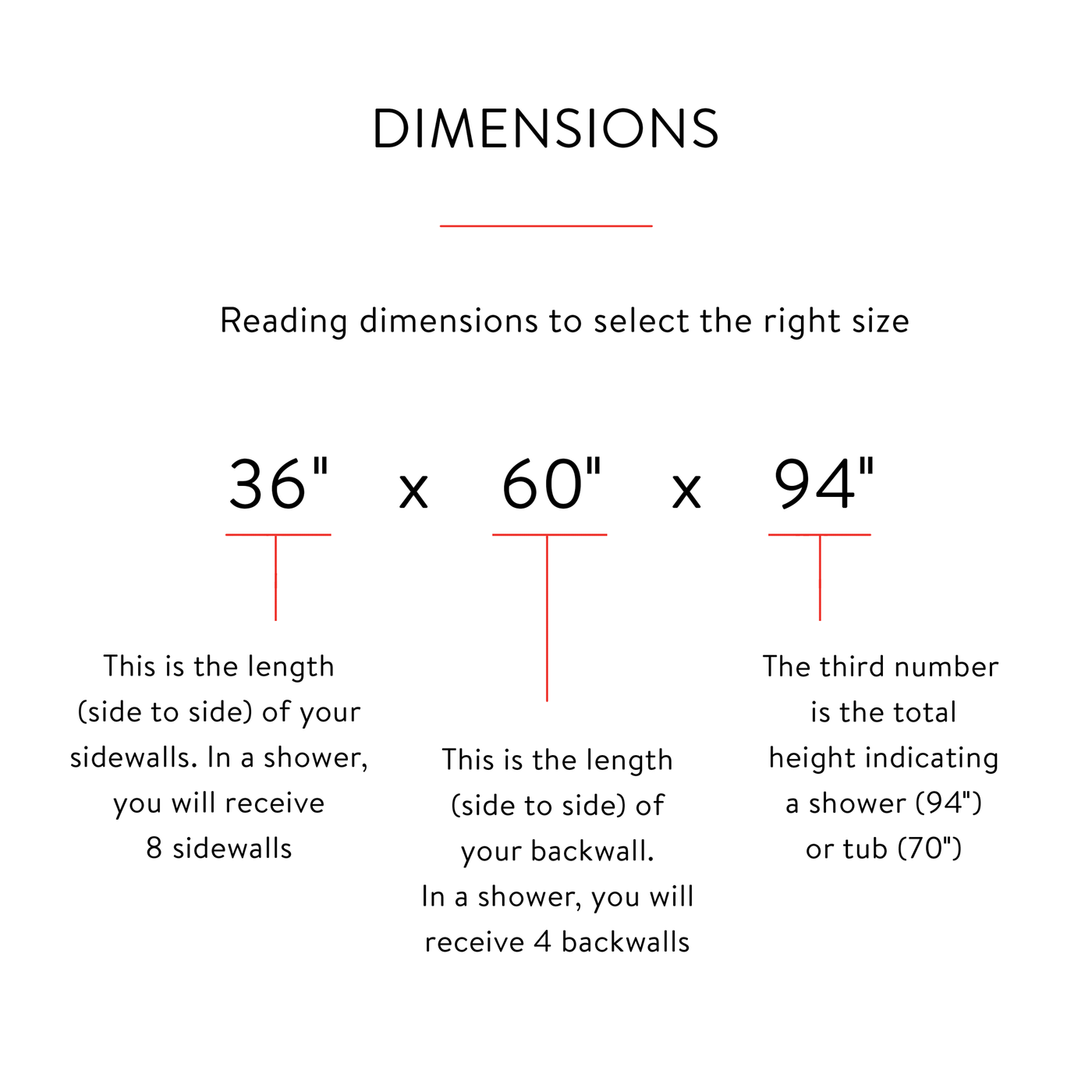 • Sq ft: 36"x36"x94" Shower Surround / 36"x48"x94" Shower Surround / 36"x60"x94" Shower Surround / 48"x48"x94" Shower Surround / 48"x60"x94" Shower Surround