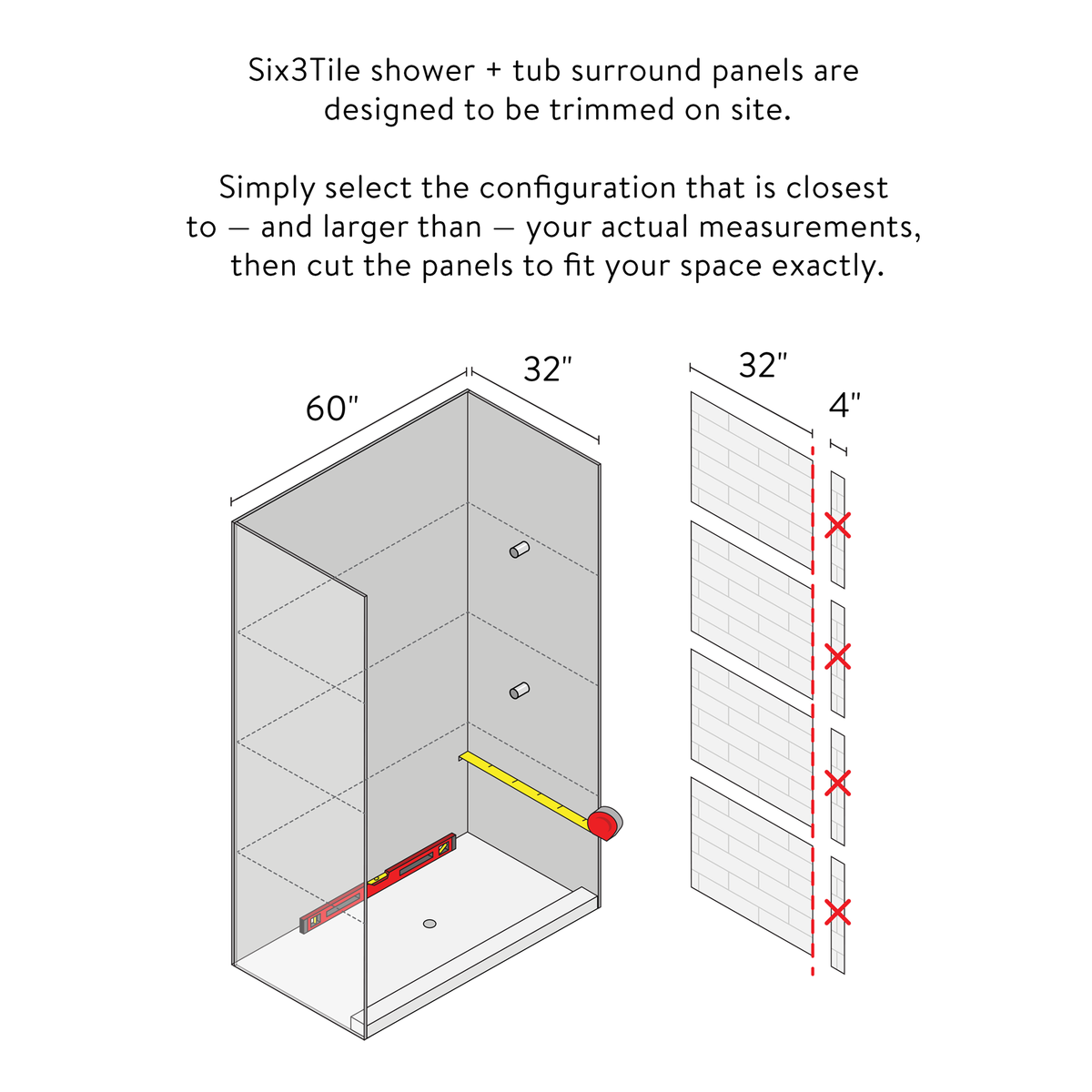 Six3Tile shower surrounds are designed to be trimmed on site for a precise fit. Simply select the configuration that is closest to—and larger than—your actual measurements, then trim the panels to fit your space exactly. This flexibility makes Six3Tile ideal for standard and non-standard shower sizes alike.