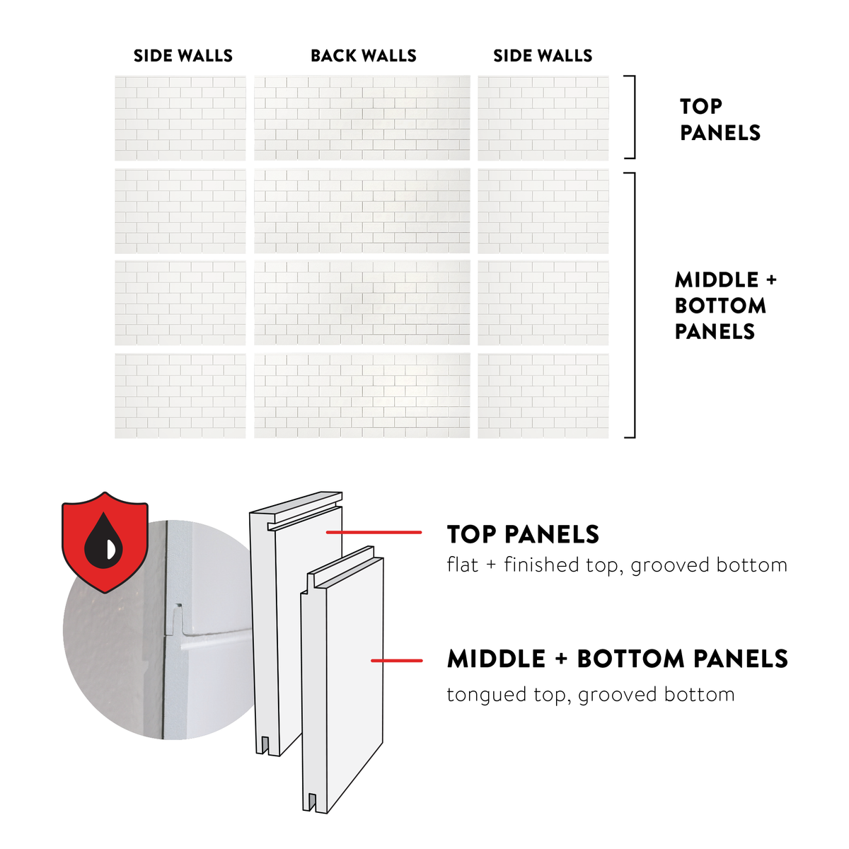 Transform your bathroom with Six3Tile shower surrounds—designed for fast installation and a polished, tile-like finish. Each shower surround includes backwall and sidewall panels to fully outfit a shower area. Our standard shower configuration contains 12 panels—4 backwall panels and 8 sidewall panels—and installs up to 94” high.