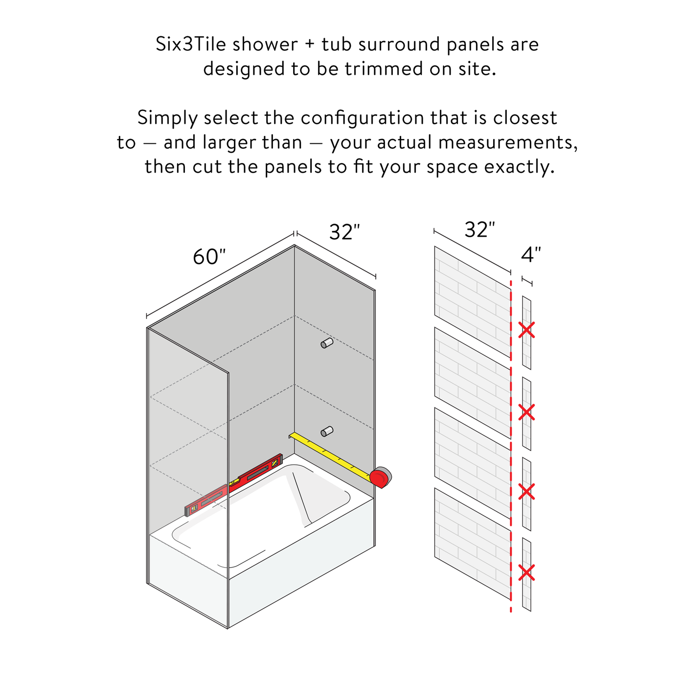 Six3Tile tub surrounds are designed to be trimmed on site for a precise fit. Simply select the standard configuration, then trim the panels as needed to match your space exactly. This flexibility makes Six3Tile tub surrounds ideal for real-world installations where walls and dimensions aren’t always perfect.